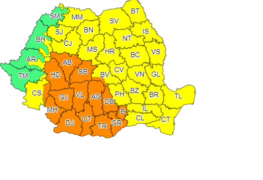 Judeţele vizate de Codul portocaliu sunt: Alba, Hunedoara, Sibiu, Mehedinţi, Gorj, Vâlcea, Argeş, Dâmboviţa, Dolj, Olt, Teleorman, Giurgiu şi Bucureşti.