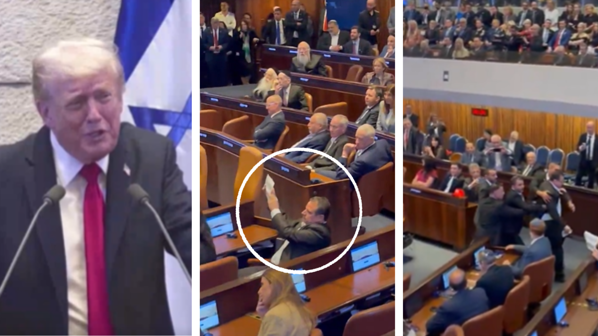 Moment surprinzător în timpul discursului lui Donald Trump din parlamentul israelian, Knesset. Doi deputați, membri ai coaliției Hadash-Taal, au afișat pancarte pro-Palestina și au vociferat, iar forțele de securitate au intervenit de urgență și i-au evacuat din plen.