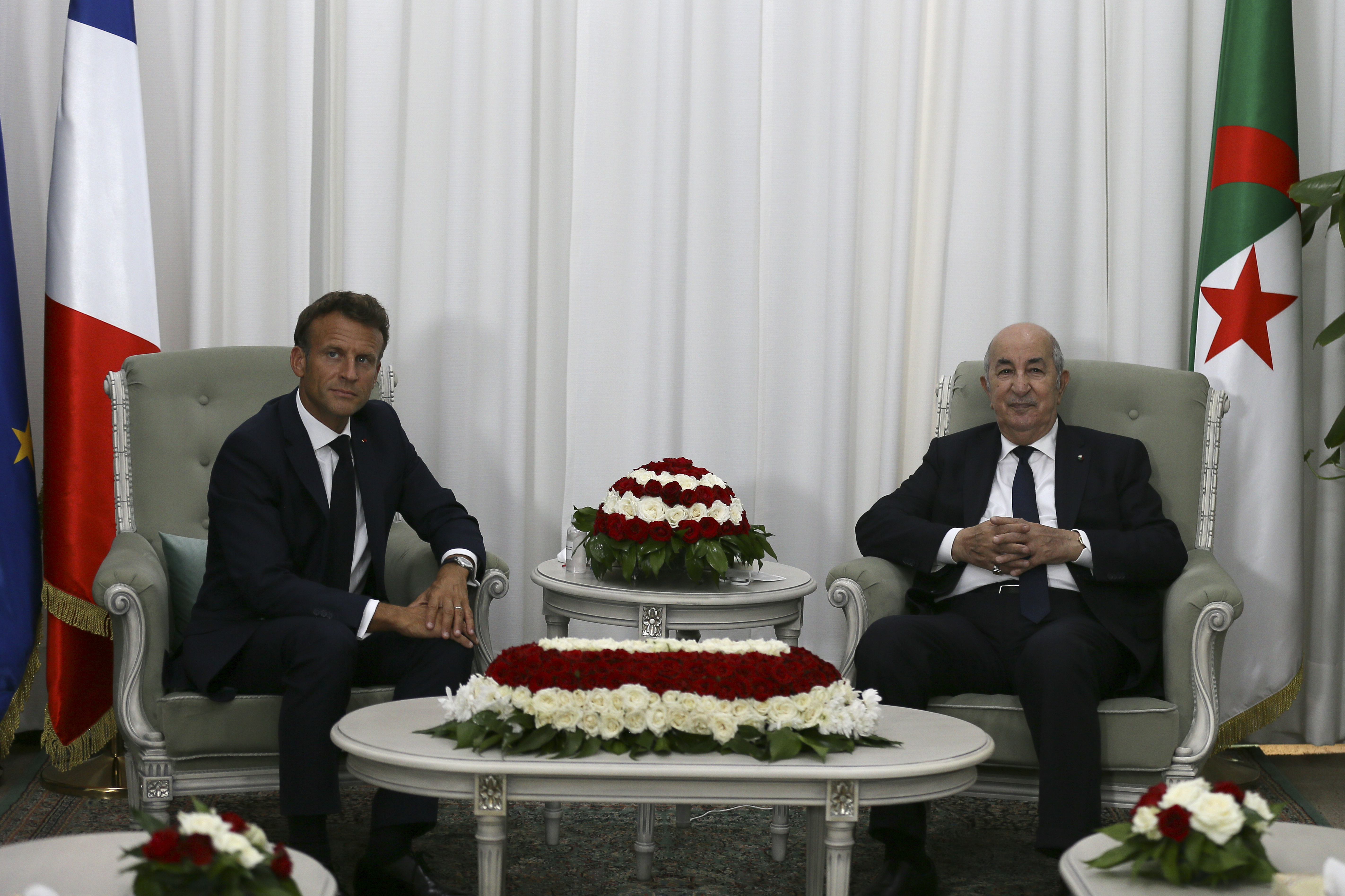 Delegaţia franceză a fost întâmpinată de preşedintele algerian Abdelmadjid Tebboune, alături de militari. Cei doi lideri de stat s-au îmbrăţişat, înainte de a se plasa sub un cort pentru a asculta imnurile naţionale ale celor două ţări, interpretate de o fanfară militară.