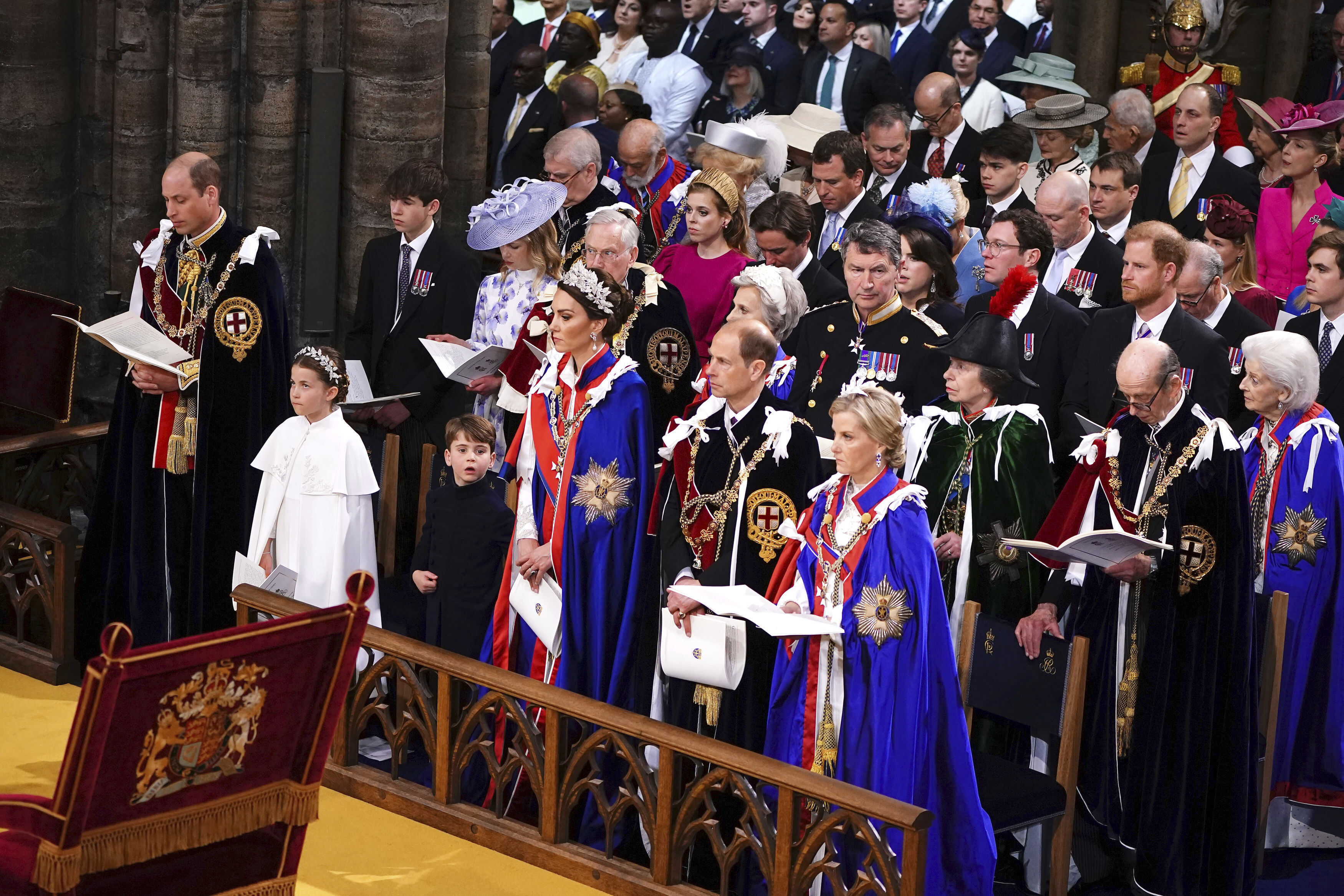 Prințul Harry a venit singur, pentru că soția lui, Meghan a rămas în SUA, alături de copiii cuplului - Archie și Lilibet. Un rol la fel de discret l-a avut și Prințul Andrew, fratele regelui, care a rămas fără titlul de Alteță Regală și fără toate titlurile și distincțiile militare, după implicarea într-un scandal sexual. Și el a fost singur, fiind divorțat de Sarah Ferguson.