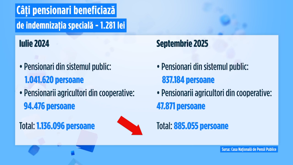 În septembrie 2025, de această plată beneficiau 885.000 de persoane. Prin comparație, în iulie 2024, numărul beneficiarilor era considerabil mai mare: peste 1.130.000 de persoane. Scăderea de peste 250.000 de beneficiari în mai puțin de un an reflectă, potrivit specialiștilor, atât evoluția demografică, cât și ajustările legislative din sistemul de pensii.