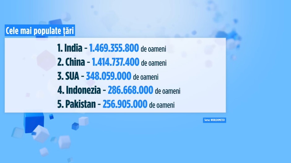 Topul celor mai populate țări e condus de India, urmată de China și la mare distanță de Statele Unite ale Americii.