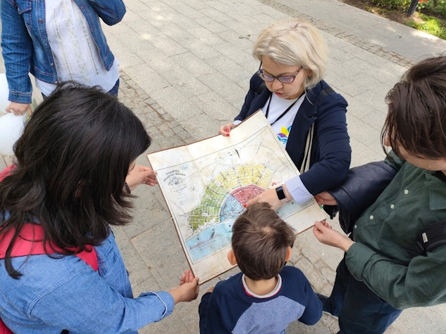 „Acum, ce fac rușii. Gândesc o tramă stradală cu totul și cu totul deosebită. Uite, noi suntem exact aici, în Piața Traian, da. Piața Poligon și Grădina Publică. Ne arată un oraș cu o tramă stradală unică, radial concentrică. Toate străzile, toate axele duc la Dunăre. Poate că și de aici vorba: “că tot orbul nimerește Brăila”, povestește Mihaela.