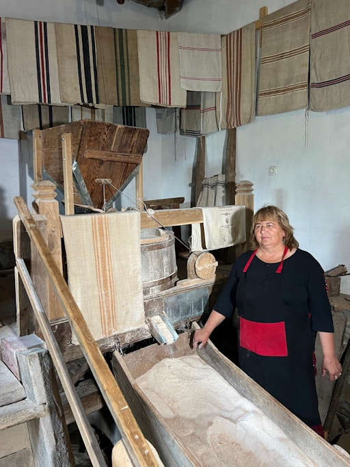 Însă nu e doar despre pâine aici. Doamna Ilona și-a propus să arate turiștilor și cum se făceau lucrurile în alte vremuri. În urmă cu 13 ani a cumpărat singura moară de apă care mai era în satul Cernat. A reabilitat-o, deși nu i-a fost chiar ușor să găsească meșterii potriviți, iar acum funcționează ca la început.