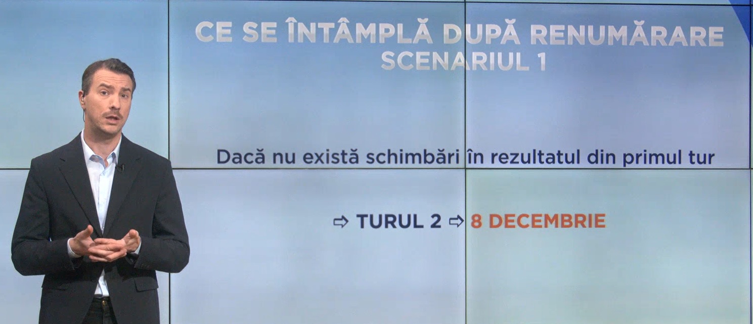 Asta înseamnă pentru noi, românii, că se menține suspansul. Vom afla rezultatul renumărării, poate cel mai devreme duminică seara, atunci când Biroul Electoral Central a setat data până la care ar trebui să se încheie acest proces de numărare din nou a voturilor. E vorba de duminică, ora 22:00, după ce s-au încheiat alegerile parlamentare. Dar atenție, această oră nu coincide neapărat și cu momentul la care vom afla și rezultatele, din cel puțin două motive. Poate că mai este nevoie de timp să fie centralizate toate procesele verbale și poate Biroul Electoral Central nu va dori să ofere public acest rezultat chiar atunci când se încheie acest proces. Poate va mai avea nevoie de timp pentru a pregăti și declarația oficială. În mod clar, se va întâmpla după ce au loc alegerile parlamentare. Știm deja că urnele se vor închide la ora 21:00 duminică seara.