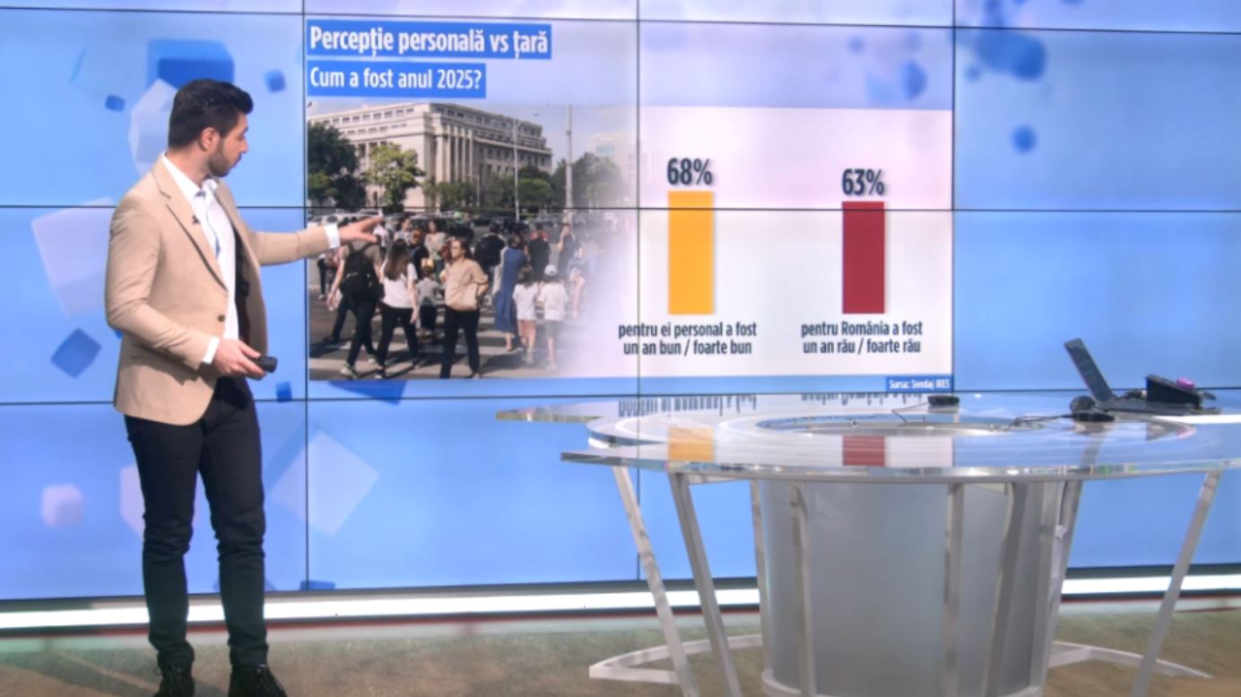 Daniel Coman, jurnalist Euronews: „Românii se descurcă individual, dar consideră că țara merge prost. Asta reiese din sondajul IRES, care arată că 68% dintre respondenți spun că, la nivel personal, au avut un an bun sau foarte bun. În schimb, 63% cred că anul 2025 a fost rău sau foarte rău pentru România, ca țară.