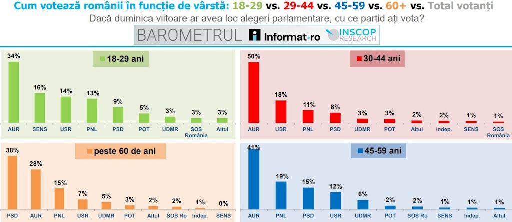 34% dintre tinerii cu vârste cuprinse între 18 și 29 de ani votează AUR, 16% votează cu partidul SENS, care nu a prins pragul parlamentar de 5%, așa că nu a intrat în parlament, din moment ce a obținut 2,99% la alegerile din noiembrie 2024. A treia preferință a tinerilor de 18-29 de ani este USR, cu 14%, iar pe locul 4 este PNL, cu 13%.