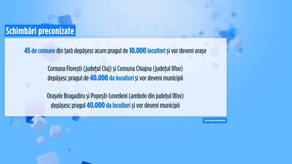 Octav Vasilescu, jurnalist Euronews România: „În prezent, o localitate trebuie să aibă minimum 40.000 de locuitori pentru a fi încadrată drept municipiu. Un oraș trebuie să aibă minimum 10.000 de locuitori. Conform surselor Euronews, Ministerul Dezvoltării propune acum un prag de minimum 25.000 de locuitori pentru rangul de municipiu, respectiv 7.000 de locuitori pentru orașe.”