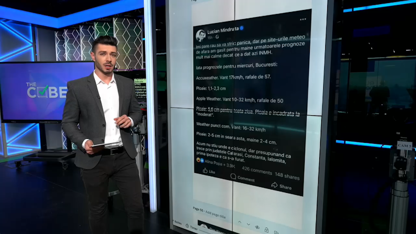 Lucian Mîndruță spune: „Îmi pare rău să vă stric panica, dar pe site-urile meteo de afară am găsit pentru mâine următoarele prognoze mult mai calme decât ce a dat azi INMH”.