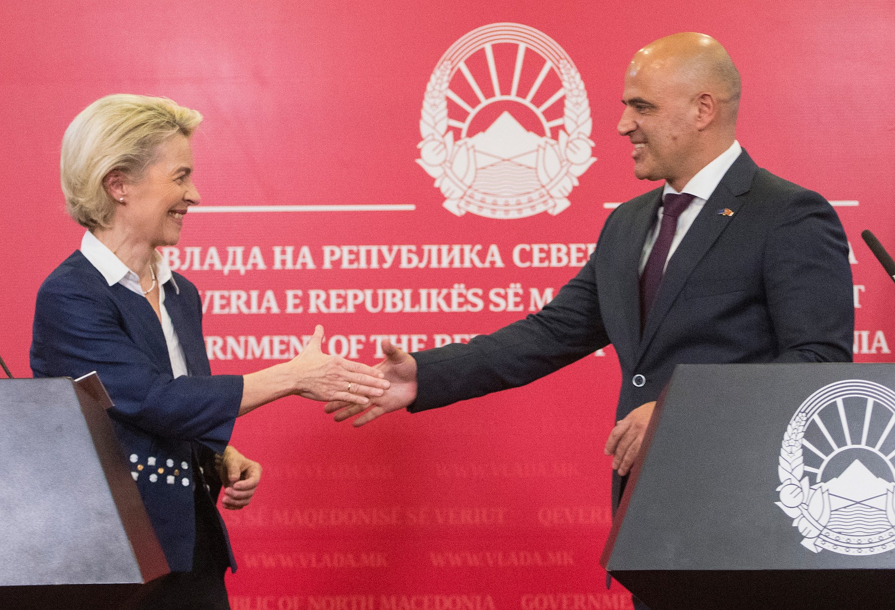 Ursula von der Leyen, președintele Comisiei Europene: „Procesul de negociere ia avânt și se derulează foarte bine, în sfârșit, și pe limba dumneavoastră. V-am promis că vom obține semnarea acordului de Frontex, traducerea lui în limba macedoneană, fără note de subsol, fără asteriscuri, pe picior de egalitate cu toate cele 24 de limbi oficiale ale Uniunii Europene. Și ne-am ținut de cuvânt.”