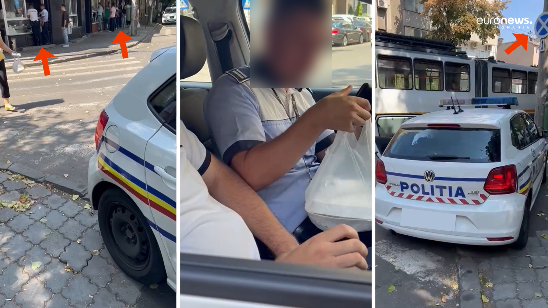 Unul dintre polițiștii surprinși în filmare a rămas de pază, pe scaunul din dreapta șoferului, ceilalți trei s-au dus după șaorma și gogoși, la două chioșcuri de peste drum, potrivit tânărului care a scos telefonul și a înregistrat scena.