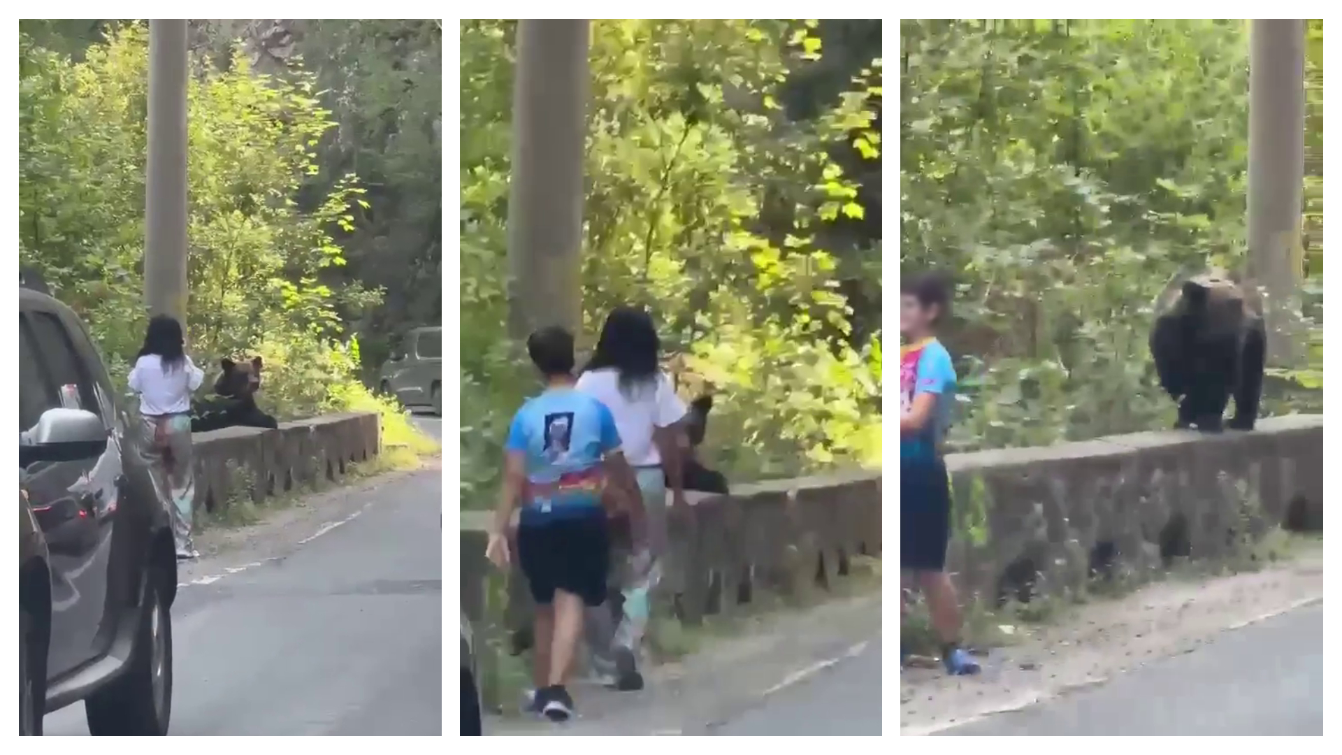 Imaginile au fost surprinse de un martor într-o localitate din județul Argeș, din apropierea barajului Vidraru. Acolo mai mulți șoferi s-au oprit să pozeze și filmeze un urs aflat pe marginea drumului. O femeie și un băiețel s-au apropiat animalul sălbatic pentru a-l hrăni, fără să ia în calcul c-ar putea fi atacați.